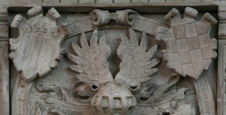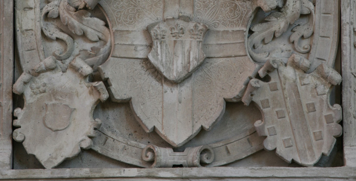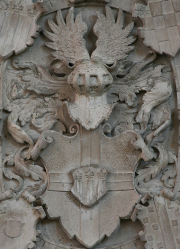 Heraldisch rechts unten sehen wir den Schild für die Familie von Hohenstein für die Großmutter väterlicherseits, in Silber ein rotes Schildchen, oben rechts begleitet von einer schwarzen Rose mit goldenem Butzen (eine Variante aus der großen mittelrheinischen Wappengruppe mit dem Schildchen); die hier nicht verwendete Helmzier wäre zu rot-silbernen Decken eine rote Spitzmütze mit silbernem Stulp, oben mit einer hahnenfederbesteckten schwarzen Kugel besteckt (Varianten bekannt). Die Familie stammt aus dem Rheingau, die Stammburg ist die katzenelnbogensche Burg Hohenstein bei Langenschwalbach. Mit Philipp von Hohenstein starb die Familie 1586 aus. Wie so viele andere katzenelnbogensche Burgmannen zeigt auch ihr Wappen in Silber ein rotes Schildchen, variiert durch ein Beizeichen. Und zuletzt sehen wir gegenüber, also heraldisch links unten, den Schild der Familie von Hoheneck für die Großmutter mütterlicherseits, in Rot ein silberner Pfahl, beiderseits begleitet von aufrechten goldenen Schindeln; die nicht verwendete Helmzier wäre zu rot-silbernen Decken ein wachsender, roter, vorne mit einem silbernen, von aufrechten goldenen Schindeln begleiteten Pfahl belegter Brackenrumpf.