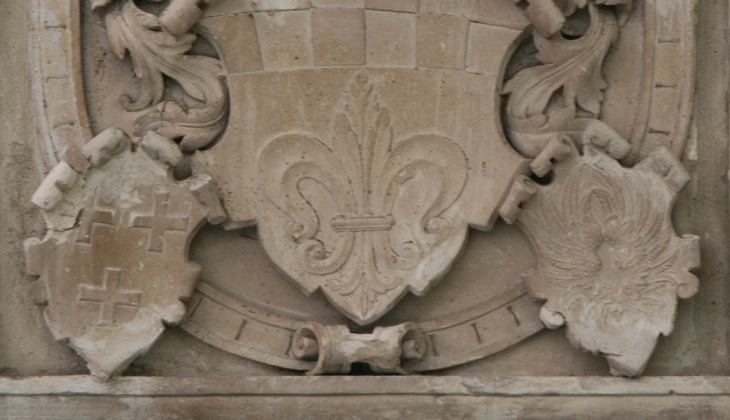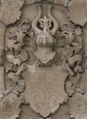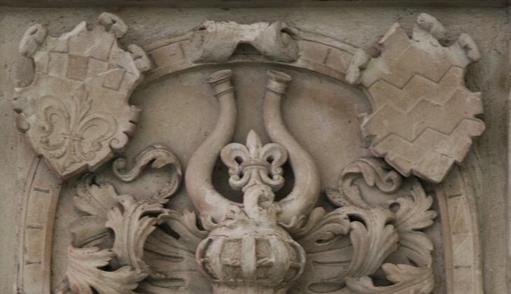 Heraldisch rechts unten sehen wir den Schild für die Familie von Schönenberg vor dem Sane, für die Großmutter väterlicherseits, in Schwarz drei (2:1) silberne Tatzenkreuze, hier wie einfache Kreuzchen. Die hier nicht verwendete Helmzier wäre zu schwarz-silbernen Decken ein auf dem Stulp mit einem (oder drei) silbernen Tatzenkreuz(en) belegter schwarzer Turnierhut, der oben mit einer hahnenfederbesteckten silbernen Kugel besetzt ist. Und zuletzt sehen wir gegenüber, also heraldisch links unten, den Schild der Familie Winter von Rüdesheim für die Großmutter mütterlicherseits, lt. Siebmacher und Zobel in einem schwarzen, mit goldenen Kleeblättchen oder Kreuzchen bestreutem Schild ein silberner gesenkter Flügel, hier ohne Kreuzchen und nur ein unten verbundener Flug, wie er für die Spor von Rüdesheim, Fuchs von Rüdesheim oder Vogt von Rüdesheim überliefert ist. Es gab mehrere Rüdesheimer Familien, die alle als Grundlage diesen gesenkten Flügel haben und sich nur hinsichtlich der Tinkturen (schwarz-silbern, schwarz-golden, golden-schwarz) und Beizeichen unterscheiden.