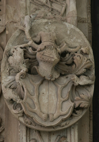 Es gibt am Epitaph zwei Wappen, die als ovale Medaillons den seitlichen Pilastern aufgelegt sind. Heraldisch rechts sehen wir das Wappen Rhodler, gespalten mit einem Hirschgeweih, auf dem Helm ein wachsender Mann zwischen zwei Hirschstangen, selbige mit seinen Händen erfassend, Tinkturen unbekannt, und gegenüber das Wappen Seel für seine Ehefrau, eine Wolfsangel, beseitet von zwei Tatzenkreuzen, auf dem Helm ein nicht näher identifizierbares wachsendes Objekt (andere Darstellung: Hund oder Wolf) zwischen einem Flug, Tinkturen unbekannt. Beide Kleinode sind oben beschädigt und lassen nicht mehr erkennen, wie sie einst oben abschlossen. Das Wappen Seel begegnet uns übrigens noch auf einem zweiten Epitaph in der Kirche. Wie die Inschrift schon andeutet, war Johann Stephan Rhodler, der ab 1569 in Heidelberg Rechtswissenschaften studiert hatte, der Sohn von Matthias Rhodler, pfalz-simmernscher Kanzler, und Drusiana Pfaff. Der Stammvater der Familie ist des Verstorbenen Großvater, Hieronymus Rhodler aus Bamberg, der am 18.3.1532 in Simmern starb, wie sein Sohn pfalz-simmernscher Kanzler. Auch für ihn gibt es ein Epitaph in der Kirche. Das Wappen Rhodler wird bei Meyer ohne Tinkturen gelistet. Des Verstorbenen Ehefrau Anna Seel, die er am 8.1.1573 geheiratet hatte, stammte aus Trier und war die Tochter von Otto Seel, pfalz-simmernscher Regierungsrat, und dessen Frau, Anna Sirck. Auch in Koblenz belegt Meyer das Wappen der Familie unter der Schreibweise Sehl, wo die Ratsherrenfamilie 1608 mit Stadtschreiber Dietrich Sehl erlosch. Weil die Ehe aufgrund des frühen Todes nur so kurz währte, gab es keine Nachkommen von Johann Stephan. Die junge Witwe Anna Seel heiratete 1578 in zweiter Ehe Dr. Nicolaus von Gülchen, Stadtsyndikus von Trier, und mit ihm zog sie 1587 nach Nürnberg, wo ihr Mann eine neue Stelle als Ratskonsulent und Advokat der Stadt hatte. Doch diese zweite Ehe wurde für sie nach anfänglicher Euphorie langfristig noch mehr zum Fiasko: Ihr Mann wurde dort in Nürnberg am 23.12.1605 durch Enthauptung öffentlich hingerichtet (die Liste der Gründe war lang: Meineid, Untreue, Veruntreuung, Fälschung, Landesverrat, Umgeldhinterziehung, Ehebruch, Notzucht, Blutschande (alles u. a. mit den eigenen Nichten) etc., sicher damals einer der hochrangigsten Delinquenten), und Anna Seel war zum zweiten Mal Witwe. Sie starb 1606 und wurde auf dem Friedhof der Nürnberger St. Sebaldus-Kirche begraben.