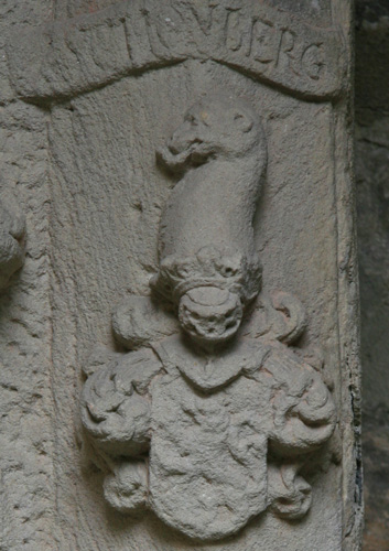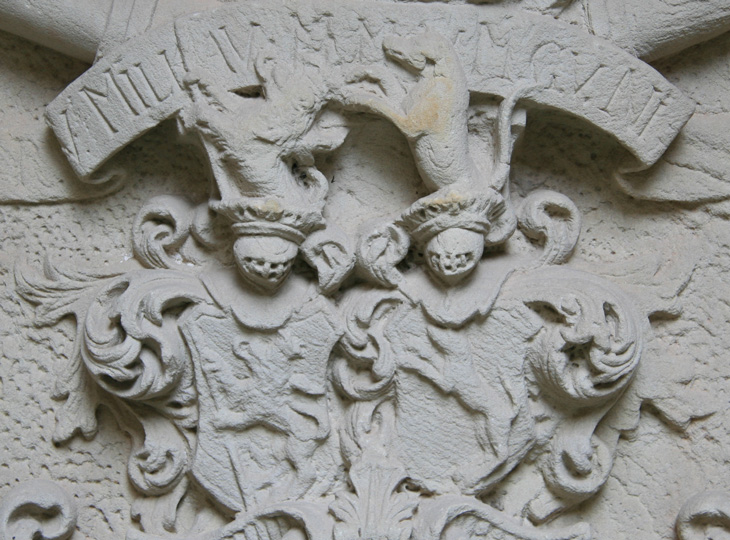 zentrales Wappenpaar mit einer stark abgekürzten Inschrift