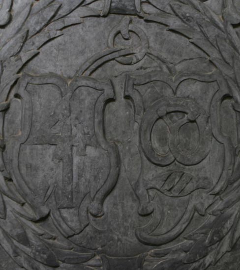 Das Wappen im Aufsatz ist ein Ehewappen, das dasjenige des Ehemannes und dasjenige der Ehefrau in einem gespaltenen Schild vereint. Beide Wappen sind typisch bürgerliche Wappen. Das Schildbild der Familie Viel zeigt eine Hausmarke, bestehend aus einem Vierkopfschaft mit gekreuzter freier Endung und mit einer vorderen Abstrebe; die Tinkturen sind unbekannt. Das Wappen der Familie Bäcker gen. Schmiedebecker ist ein redendes, das vom namengebenden Beruf abgeleitete ist, eine liegende Brezel über einem mehrfach schräg eingeritzten und an den Enden kugelförmig geformten Brötchen.