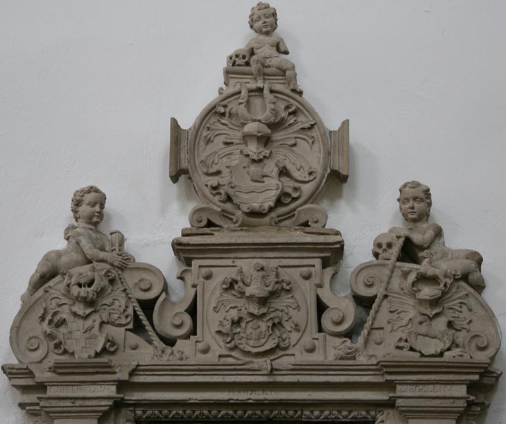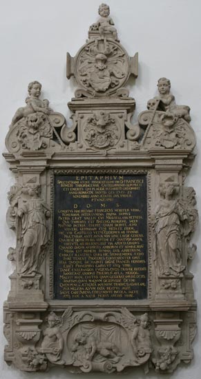 Dieses Epitaph ist an der Südwestseite des Langhauses zu finden, am dritten Pfeiler des Hauptschiffes und zwischen dem zweiten und dritten Arkadenbogen, von Südosten gerechnet. Das 1601 angefertigte Kunstwerk von unbekanntem Bildhauer ist 2,10 m hoch und 1,20 m breit. Das Material ist Tuffstein mit im Zentralfeld eingelegter schwarzer Schiefertafel für die in goldenen Lettern aufgeführte Kapitalis-Inschrift mit zwei Abschnitten (Sterbeinschrift oben und Grabgedicht in Distichen unten). Insgesamt besitzt das Grabmonument den Aufbau einer dreizonigen Aedikula. Die Hauptzone wird von zwei allegorischen Frauengestalten flankiert, deren Unterarme sämtlich verloren gegangen sind. In der Unterhangzone ist eine querovale Rollwerkkartusche angebracht, in der ein schlafender Putto mit Sanduhr als Memento mori dargestellt wird. Zwei aus der Kartusche hervorwachsende, nach außen gewendete, oberhalbe geflügelte erotische Putten begleiteten die Kartusche. Der sich über dem Hauptgesims erhebende Aufsatz enthält neben den vier unten zu beschreibenden Wappen drei (1:2) Putten mit Todessymbolen, so hält der rechte einen Totenschädel und einen sich aufdrehenden Tampen, der linke eine Sanduhr und einen zweiten sich in seine Kardeele auflösenden Tampen, und der obere hält einen weiteren Schädel.