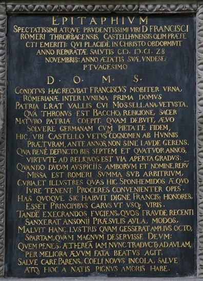 Die Inschrift lautet: "EPITAPHIVM / SPECTATISSIMI ATQVE PRVDENTISSIMI VIRI D(OMINI) FRANCISCI / ROMERI THRORBACENSIS, CASTELLHVNENSIS OLIM PRAEFE/CTI EMERITI: QVI PLACIDE IN CHRISTO OBDORMIVIT / ANNO REPARATAE SALVTIS M. D. CI. 28 / NOVEMBRIS: ANNO AETATIS SVAE VNDESE=/PTVAGESIMO // D(EO) O(PTIMO) M(AXIMO) S(ACRVM) / CONDITVS HAC RECVBAT FRANCISCVS MOLLITER VRNA, / RÖMERIANAE INTER LVMINA PRIMA DOMVS / PATRIA ERAT VALLIS CVI MOSSELLANA, VETVSTA, / QVA THRONVS EST BACCHO, RELLIGIONE, SACER / MATVRO PATRIAE COEPIT, QVAM DEBVIT, AEVO, / SOLVERE GERMANAM CVM PIETATE FIDEM, / HIC, VBI CASTELLO VETVS EST COGNOMEN AB HVNNIS / PRAETVRAM, ANTE ANNOS, NON SINE LAVDE GERENS / QVA BENE DEFVNCTO BIS SEPTEM ET QVATVOR ANNOS, / VIRTVTE AD RELIQVOS EST VIA APERTA GRADVS: / QVANDO DVCVM AVSPICIIS AMBORVM ET NOMINE, RERV(M)/MISSA EST ROMERI SVMMA SVB ARBITRIVM, / CVRIA, ET ILLVSTRES QVAS HIC SPONHEMIDOS AEQVO / IVRE TENENT PROCERES CONVENIENTER OPES. / HAS QVOQVE SIC HABVIT DIGNE FRANCIS(CVS) HONORES, / ESSET PRINCIPIBVS CARVS VT VSQ(VE) VIRIS / TANDE(M) EXECRANDOS FVGIENS, QVOS FRAVDE RECENTI / SANXERAT ANSONII PRAESVLIS AVLA, MODOS, / MALVIT HANC, LVSTRIS QVAM GESSERAT AMPLIVS OCTO, / SPARTAM, QVAM MAGNVM DESERVISSE DEVM: / QVEM PENES, AETHEREA(M) IAM NVNC TRADVCT(VS) AD AVLAM, / PER MELIORA AEVVM FATA BEATVS AGIT / SALVE CARE PARENS, COELI NOVVS INCOLA; SALVE / ATQ(VE) HOC A NATIS PIGNVS AMORIS HABE." - Epitaph des sehr geachteten und sehr klugen Mannes, des Herrn Franziscus Römer aus Trarbach, einstiger und emeritierter Amtmann von Kastellaun, der sanft in Christus entschlafen ist im Jahr der Wiederherstellung des Heils 1601 am 28. November, seines Alters im 69. Lebensjahr. Dem besten und größten Gott geweiht, geborgen in dieser Urne ruht sanft Franz, eines der hell leuchtendsten Mitglieder des Hauses Römer. Seine Heimat war das Moseltal, das altehrwürdige, in dem der Thron des Bacchus steht, heilig durch die Religion. In reifem Alter begann er, dem Vaterland in frommer Pflichterfüllung die rechte Treue zu erweisen, wie es sich ziemt. Hier, wo das Kastell den alten Beinamen von den Hunnen trägt, übte er nicht ohne Wertschätzung vor Jahren das Schultheißenamt aus. Nachdem er dieses zweimal sieben und vier Jahre lang gut verwaltet hatte, wurde ihm dank seiner Tugend der Weg zu den übrigen Rängen eröffnet, als auf Geheiß und im Namen beider Herzöge die oberste Leitung des Gemeinwesens der Schiedsgewalt des Römer unterstellt wurde und auch die Machtmittel, die hier die Vornehmen der Sponheimer mit gleichem Recht in geziemender Weise besitzen. Auch diese Ehrenstellung hielt Franz so würdevoll inne, daß er den Fürsten immer wertvoll war. Schließlich verweigerte er sich den fluchwürdigen Prozeßmethoden, die jüngst der Hof des römischen Bischofs trugvoll angeordnet hatte, und zog es vor, lieber dieses Amt, das er mehr als acht Jahresläufe innegehabt hatte, aufzugeben, als sich vor dem großen Gott abzukehren. Bei dem letzteren weilt er nun, hinübergeführt zum himmlischen Palast, als ein Seliger und genießt ein besseres Schicksal. Sei gegrüßt lieber Vater, neuer Bewohner des Himmels, sei gegrüßt, und empfange dies als Zeichen der Liebe von den Söhnen.