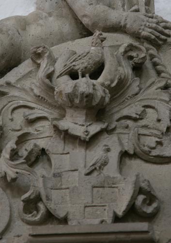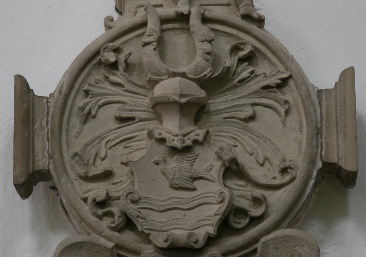 Über dem optisch linken Pilaster ist das gewendete Vollwappen der von Koppenstein angebracht, blau-golden geschacht mit einem roten Freiviertel, darin ein Vogel (nach Gruber ein schwarzer Rabe, nach Siebmacher ein silberner Vogel), auf dem Helm mit blau-goldenen Decken der Vogel zwischen zwei blau-golden geschachten Büffelhörnern, wobei hier die Details nicht aufgelöst sind. Bei den Koppensteinern gibt es noch andere Varianten, vgl. bei Zobel. Franz Römer hat vor 1555 in erster Ehe Barbara Koppensteiner (-1569) aus Trarbach geheiratet, für die in der Kirche ebenfalls ein Epitaph existiert. Über dem optisch rechten Pilaster ist das Wappen der Familie Ziegelein angebracht, ein aufspringendes Pferd, desgleichen auf dem Helm; die Tinkturen des nicht in den Standardsammlungen verzeichneten Wappens sind unbekannt. Franz Römer hat am 19.1.1573 in dritter Ehe Philippina Ziegelein geheiratet, die aus Andernach stammende Tochter von Melchior Ziegelein.