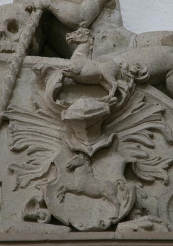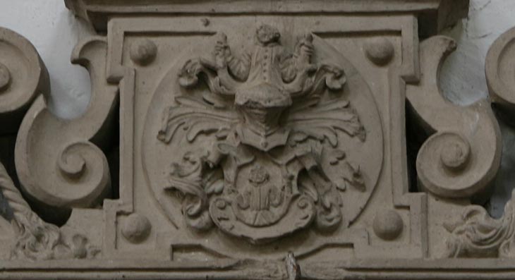 Darunter sind insgesamt drei Vollwappen auf einer Ebene angebracht; in der Mitte sehen wir das Wappen Rhodler. Interessant ist der Vergleich mit Epitaphien in Simmern, wo mehrfach ein Wappen Rhodler auftaucht. Dort ist der Schild gespalten mit einem Hirschgeweih, auf dem Helm ein wachsender Mann zwischen zwei Hirschstangen, selbige mit seinen Händen erfassend, Tinkturen unbekannt, hier ist das Motiv gleichlautend in Schild und Kleinod mit dem wachsenden Mann zu sehen, der die zwei Hirschstangen mit den Händen ergreift. Franz Römer hat am 21.8.1570 in zweiter Ehe Elisabeth Rhodler geheiratet, wahrscheinlich die Tochter von Dr. Matthias Rhodler, der pfalz-simmernscher Kanzler war, jedenfalls die Witwe von Philipp Flad aus Kirchberg.
