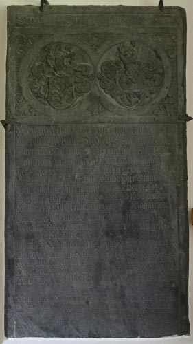 Diese 1666 angefertigte Grabplatte ist am Nordwestende des nördlichen Seitenschiffs angebracht, an der Stirnseite des letzten Seitenschiffkompartimentes. Die 1,55 m hohe und 0,82 m breite schwarze Schieferplatte erinnert an den Pfarrer Jeremias Heiderich Orth (-12.9.1635) und seine Ehefrau Anna Elisabeth Weis (-8.2.1637). Die Inschrift lautet: "Grab: vnd Ehrengedächtnusz // Weyland desz Ehrwurdigen vnd Wohlge/lahrte(n) h(e)r(rn) Jeremiae Heiderici Orthii geweszenen / Pfar(r)ers Zu Castelhun Vnd Inspectors der hinder(e)n / graffschafft Sponheim gebor(e)n Zu Marpurg wel=/cher A(nn)o 1635 den 12t(en) (Septem)bris seelig gestorbe(n), so dan(n) / der Tugentsame(n) fraue(n) Annae Elisabethae Weisin von / Braubach seiner hertzlieben hauszfrauen, welche A(nn)o 1637 / den 8 febr(uarii) selig nachgefolgt vnd A(nn)o 1666 auffgericht / von dero hinterlaszene(n) kindern, Nahmens / Johann Reinhardt Collector Zu Winterburg. / Jeremias Balbierer vndt Bruchschnider, ungelier / gerichtschöffen. / Johannes Not(arius) Publ(icus) Caes(areus) und Kirche(n)scheff Zu Trorbach, v(n)d / Maria Dorothea h(e)r(rn) Nicola(i) Vielen Ambt: vndt Gerichtschrei/bers zu Castelhun ehliche hauszfrau.", gefolgt von einem Bibelzitat "Danielis am 12 Cap. / Die lehrer aber werde(n) leuchte(n) wie desz him(m)els glantz, vnd die / so viel Zur gerechtigkeit weisen wie die sterne(n) Jm(m)er v(n)d ewiglich" und dem Spruch "der Mutter Rede /Ob ich gleich hinderlas(s)e betrübte Kinderlein, der noth mich über die / maszen Jam(m)ert im hertzen mein, wil(l) ich doch gerne sterben vndt / trauen meinem Gott, er wirdt sie wirdt sie wohl versorgen / Retten ausz aller noth." Bei der Inschrift wechselt die Schrifttype je nach Sprache von Fraktur für die deutschen Wörter zu Kapitalis und humanistischer Minuskel für die eingestreuten lateinischen Wörter.
