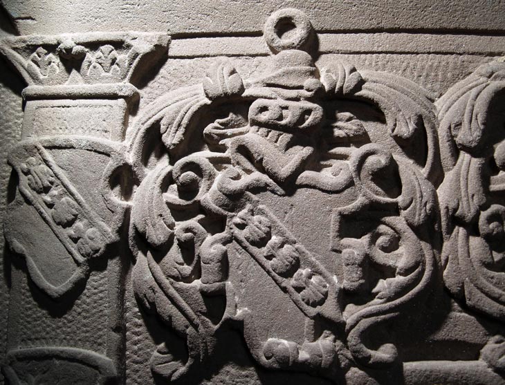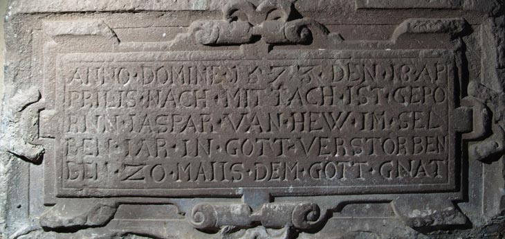 Hier soll ein zweites Kindergrabdenkmal vorgestellt werden, dasjenige für den als Kleinkind verstorbenen Gaspard III. de Heu / de Huy (18.4.1573-20.5.1573). Die traurig kurzen Lebensdaten gehen aus der Inschrift im Sockelbereich hervor: "ANNO DOMINE 1573 DEN 18 AP/RILIS NACH MITTACH IST GEPO / RNN IASPAR VAN HEW IM SEL/BEN IAR IN GOTT VERSTORBEN / DEN 20 MAIIS DEM GOTT GNAT".