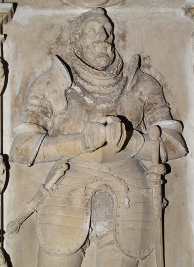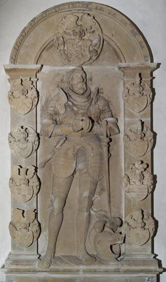 Das Epitaph zeigt in der von zwei Wandvorlagen und einem Abschlußbogen gebildeten Nische den leicht nach links gewendeten Verstorbenen in voller Ritterrüstung, nur den Helm mit Federschmuck hat er neben seinem linken Fuß abgestellt. Er ist mit Schwert und Dolch bewaffnet.