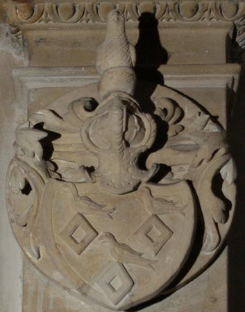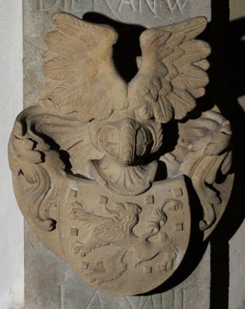 Seitlich tragen die Pilaster insgesamt acht Wappenschilde einer Ahnenprobe. Es fällt auf, daß hier die Familien zu den eher einfachen oder niederadeligen Familien gehören, ganz im Gegensatz zu dem sonst üblichen Heiratsverhalten im Hause Nassau-Vianden oder Nassau-Dillenburg. Auch gibt es hier keinerlei Vermehrung des Nassauer Stammwappens, wie sie Ende des 16. Jh. allgemein im Hause Nassau üblich waren. Das liegt daran, daß Heinrich ein Vertreter einer unehelichen, illegitimen Linie war, und diese Linie mußte nicht nur auf alle zusätzlichen Felder mangels Anspruch darauf verzichten, sondern auch ihre Heiratspartner gesellschaftlich erheblich tiefer suchen als die Hauptlinien. Auf der Schwertseite wiederholt sich ganz oben das Wappen der Nassauer wie beschrieben ("NASSAVWE"). Der Vater des Probanden war Johann von Nassau, verheiratet mit Betarix de Belva / de Belvaux. Deren Wappen ("BELLVA") zeigt in Silber drei (2:1) rote Fensterrauten, auf denen jeweils eine schwarze Merlette sitzt (frz. d'argent à trois mâcles de gueules sommées chacune d'une merlette de sable), auf dem Helm eine der schwarzen Merletten (cimier: une merlette de l'écu), so hier, oder nach Loutsch auch eine rote Fensterraute mit einer schwarzen Merlette darauf zwischen einem silbernen Flug (une mâcle de gueules sommée d'une merlette de sable, le tout entre un vol d'argent).