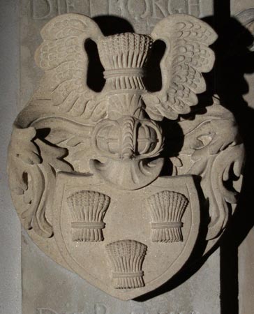 Nun kommen wir zur Generation der Urgroßeltern. Väterlicherseits waren das der illegitime Sproß der Linie Nassau-Dillenburg-Breda, Johann von Nassau, der 1451 als Rentmeister zu Vianden genannt wird und der 1455 den Hof Amel im Lande St. Vith für 200 Gulden erpfändete, und seine Frau, Jeannette bzw. Johanna von der Rouwen (Rauwen, Ruwen), die am 5.2.1457 Güter zu St. Vith erpfändete. Die anderen beiden Urgroßeltern waren Nikolaus Laudolff bzw. Ludolf von Bitburg und seine Frau, Lisa oder Lysa von Beifels (Byvels). Das Wappen der einen Urgroßmutter ("DIE RANW") zeigt in Blau drei (2:1) goldene, mit einem goldenen Band gebundene Garben (frz.: d'azur à tris gerbes d'or liées du même), auf dem Helm eine goldene Garbe zwischen einem blau-golden gevierten Flug (frz.: cimier: une des gerbes entre un vol écartelé d'azur et d'or). Das Wappen der anderen Urgroßmutter ("BEYVELS") ist mehrfach von Hermelin und Rot geteilt (frz.: burelé d'hermine et de gueules), im Loutsch die andere Reihenfolge, also von Rot und Hermelin mehrfach geteilt, auf dem Helm hier mehrere (5) Straußenfedern, nach Loutsch ganz anders ein wie der Schild bezeichneter Flug (un vol aux armes); die Wappen sind beide auf einer Ebene angebracht, jeweils auf der dritten Position der Schwert- und der Spindelseite. Der Vorfahr dieses illegitimen Johanns war Engelbert I. Graf von Nassau-Dillenburg, Herr von Breda, der im Jahre 1417 die Grafschaft Vianden erbte und Johanna von Polanen geheiratet hatte, die Erbin von Breda.