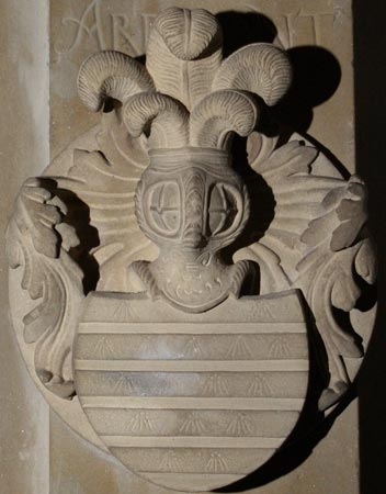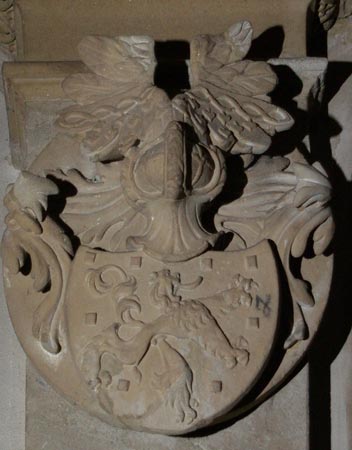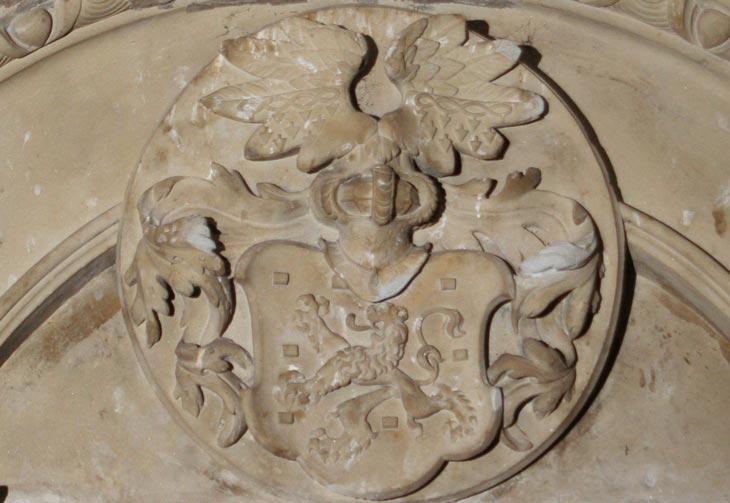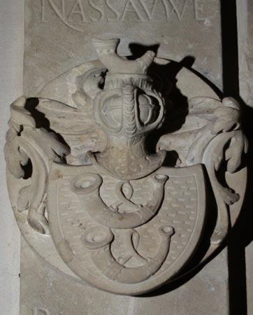 Im Bogenfeld ist, auf den Rundbogenrahmen übergreifend, ein rundes Medaillon ohne Rahmung mit dem Vollwappen der Herren von Nassau angebracht, in blauem und mit goldenen aufrechten Schindeln bestreuten Feld ein goldener und ungekrönter Löwe, rot gezungt, rot bewehrt, auf dem Helm mit blau-goldenen Decken ein schwarzer Flug, im unteren Teil ein verschlungenes Band als Trenner, darunter mit goldenen Lindenblättern bestreut. Die Details weisen den Wappenträger als Sproß der ottonischen Linie aus.