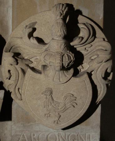 Die Vorfahren der anderen, mütterlichen Seite waren Godefroid de Belvaux and Béatrice de la Vaulx und Winkin d'Arimont und eine Frau de Recogne. Das Wappen der ersten Urgroßmutter ("LA VAHL") weicht erheblich von den Erwartungen ab, die eigentlich in Schwarz drei silberne Türme hier sähen (Loutsch: de sable à trois tours à l'antique d'argent, cimier un tambour d'argent, surmonté de deux baguettes de gueules, en sautoir), statt dessen sehen wir eine Wiederholung des typischen Nassauer Wappens mit dem Löwen und den Schindeln. Denn selbst die de Vaulx aus der Dauphiné, hier eher unwahrscheinlich, hatten zwar einen Löwen im Schild, aber keine Schindeln. Die Familie scheint ein Zweig der Familie de Bazeilles zu sein, die sich nach ihrem Sitz Lavaulx bei Montmédy nannte. Das Wappen der zweiten Urgroßmutter ("ARCONGNI") zeigt in Gold einen roten Hahn (frz.: d'or au coq de gueules; Loutsch nennt noch als weitere mögliche Varianten: d'argent au coq de gueules, patté et crêté d'or, oder: d'or au coq d'argent, crêté, couronné et barbé de gueules), auf dem Helm der Hahn wachsend (nach Loutsch abweichend ein Flug, cimier: un vol de gueules et d'or, oder un vol d'or et de gueules); die Wappen sind beide auf einer Ebene angebracht, jeweils auf der vierten und letzten Position der Schwert- und der Spindelseite. Insofern ist die Ahnenprobe nicht ganz logisch, wir sehen als Anordnung nicht 1 - 2 / 3 - 4 / 5 - 6 / 7 - 8, sondern 1 - 2 / 3 - 4 / 5 - 7 / 6 - 8. Abgesehen von dieser logischen Abweichung haben wir ein Wappen, das fehl am Platze ist, und mehrere Differenzen bei den Kleinoden zwischen Befund und Literatur.