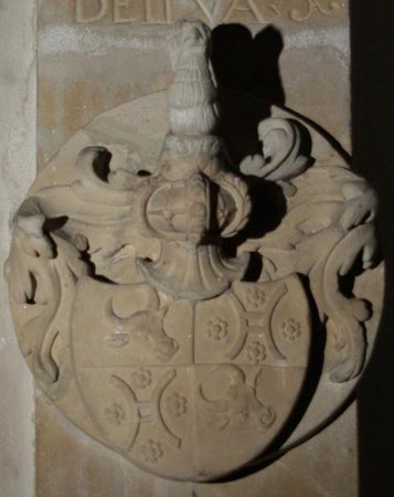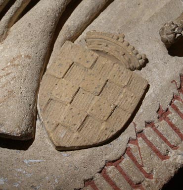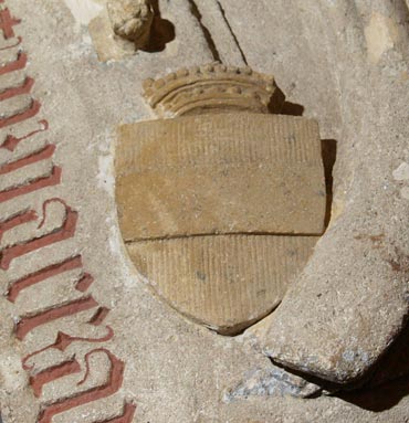 Entsprechend sehen wir an der Tumba zwei Wappenschilde, zum einen ihr eigenes Wappen Vianden, in Rot ein silberner Balken (Abb. oben links), zum anderen das Wappen der Vordergrafschaft Sponheim, blau-golden geschacht (Abb. oben rechts). Die Schraffur ist hier unzutreffend, denn die würde rot-golden bedeuten, aber ein solches Schach führten die Sponheimer in keiner Linie. Marie von Vianden hatte eine Tochter, Elisabeth Gräfin von Sponheim-Vianden (1365-3.9.1417), die in erster Ehe mit Engelbert III. Graf von der Mark und in zweiter Ehe am 29.8.1392 in Alzey mit Ruprecht Pipan Erbprinz bei Rhein (20.2.1375-25.1.1397) verheiratet war. Besagte Tochter war 1414-1417 Gräfin der Vordergrafschaft und starb kinderlos als letzte der Linie, sie schenkt 1/5 der Vordergrafschaft an Kurfürst Ludwig von der Pfalz, die anderen 4/5 gingen an die andere Linie der Hintergrafschaft.