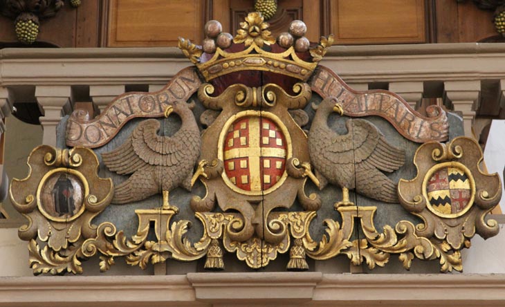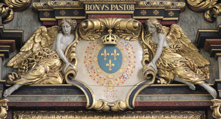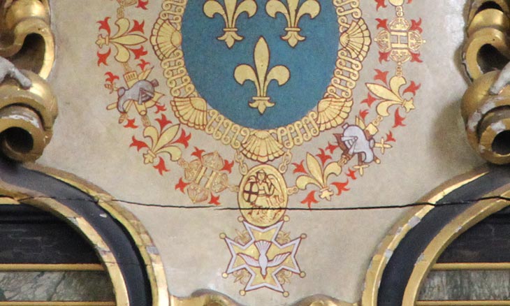 Wir sehen am Altar deswegen das französische Lilienwappen Ludwigs XIV., in Blau drei (2:1) goldene Lilien (d'azur à trois fleurs de lis d'or). Als Schildhalter dienen zwei Engel, in der französischen Heraldik silbern gekleidet und mit goldenen Flügeln, mit offenem goldenem Haar. Der ovale Schild wird umgeben von zwei Orden. Der innere Orden ist der Ordre de St. Michel (Michaelsorden), die Kette besteht aus mit Knotenschnüren verbundenen Muscheln, das Medaillon zeigt des Hl. Michael als Drachenbezwinger mit einem Schild mit Kreuzmotiv. Der Orden wurde 1469 als Konkurrenz zum Orden vom Goldenen Vlies gegründet und unterstand der Leitung durch den König, wodurch die auf ihn vereidigten Angehörigen des Hochadels besonders an das Königshaus gebunden wurden. Die äußere Kette ist der Ordre du Saint Esprit (Orden vom Heiligen Geist), typisch ist das achtspitzige Ordenskreuz mit der gestürzten silbernen Taube als Symbol für den Heiligen Geist. In den Winkeln zwischen den Kreuzarmen sind goldene Lilien angebracht. Die Ordenskette weist einerseits mit Lilien belegte Glieder auf. Andere Glieder zeigen den von Kronen umgebenen Buchstaben "H" für den Gründer Henri III., und die dritte Sorte Glieder trägt Trophäen (Helme und Waffen). Alle Glieder tragen in den Winkeln rote Flämmchen. Der Orden wurde 1578 gegründet und ist der bedeutendste französische Ritterorden. Von 1643 bis 1715 war König Ludwig XIV. der vierte Großmeister (grand maître) des Ordens. In der französischen Revolution wurde der Orden aufgehoben. 1814-1830 gab es noch einmal eine Wiederbelebung. Der Lilienschild der Bourbonen wird bekrönt von der französischen Königskrone mit Lilienschmuck.
