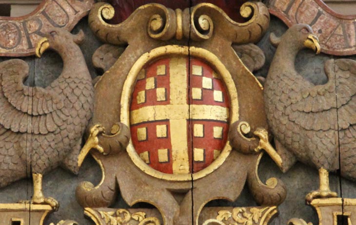 Mit diesem Wappen an der Orgelempore wechseln wir von der französischen Epoche Luxemburgs zur zweiten spanischen Epoche. Ernest Dominique Alexandre de Croy-Ligne, Herzog von Arenberg, Prince de Chimay, war der letzte Gouverneur der ersten spanischen Epoche, und er mußte kapitulieren und die Stadt an François de Créquy, marquis de Marines (-4.2.1687), übergeben. Der Herzog von Arenberg wurde danach Vizekönig von Navarra und starb am 3.6.1686 in Pamplona. Mit der Annexion Luxemburgs durch Frankreich wurden nun französische Gouverneure eingesetzt, erst Henri marquis de Lampert (-1.8.1686, amtierte 1684-1686), dann Louis-François erst comte dann duc de Boufflers (-22.8.1711, amtierte 1686-1687), dann Nicolas de Laye du Blé, marquis d'Huxelles (-10.4.1730, amtierte 1687-1688), gefolgt von Nicolas de Catinat, seigneur de St. Gratien (-23.2.1712, amtierte 1688-1690), dann Henri, duc d'Harcourt (-19.10.1718, amtierte ab 1690), dann Louis-François du Parc, marquis de Locmaria (-14.10.1709) als letzter französischer Gouverneur Luxemburgs bis 1697. Und nach dem Übergang an die spanische Herrschaft wurde Jean-Frédéric comte d'Autel (7.9.1645-1.8.1716) als neuer Gouverneur eingesetzt und amtierte 1697-1714, bis Luxemburg im Frieden von Rastatt 1714 an Österreich kam. Erst mit der Ankunft der österreichischen Verwaltung wurde er aus dem Amt entfernt. Deshalb kann dieses Wappen Jean-Frédéric comte d'Autel als Stifter zugeordnet werden, dem damaligen Luxemburger Gouverneur. Außerdem war er Herr von Lahr, Mersch (Wappen an der Kirche), Fels (La Rochette), Heffingen, Nieuwdorp und Waterscheide und zeitweise auch von Remich und Vogelsang bei Hassel. Das Wappen Larochette wird dadurch erklärt, daß er der Sohn von Godefroid dAutel (-1672) und Apollonie de Larochette war. Jean-Frédéric comte d'Autel war auf der spanischen Seite positioniert, Berater des spanischen Königs und wurde am 20.12.1685 von König Karl II. von Spanien in den Grafenstand erhoben. Am 19.12.1705 nahm ihn der spanische König Philipp V. in den Orden vom Goldenen Vlies auf. Da hier am Wappen keine entsprechende Collane zu sehen ist, datiert das Schnitzwerk also aus der Zeit 1685-1705, also zwischen der Grafenstandserhebung (vorher ohne die Schildhalter) und der Mitgliedschaft im Orden vom Goldenen Vlies (danach mit Collane). Jean-Frédéric comte d'Autel trat im Spanischen Erbfolgekrieg als Generalleutnant zunächst auf kurpfälzischer Seite in den Krieg ein, dann wechselte er in kaiserliche Dienste als Feldmarschallleutnant und Artillerieinspektor. Der Graf d'Autel wurde in der Franziskanerkirche Luxemburg bestattet. Dort befand sich vor deren Zerstörung und Abtragung links im Chor ein Grabdenkmal mit einer 8er-Ahnenprobe.
