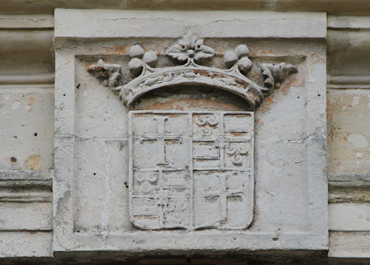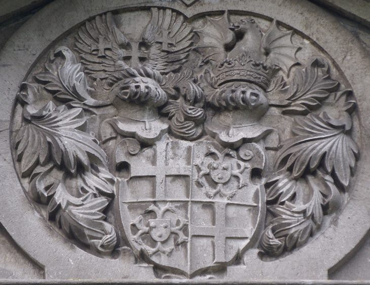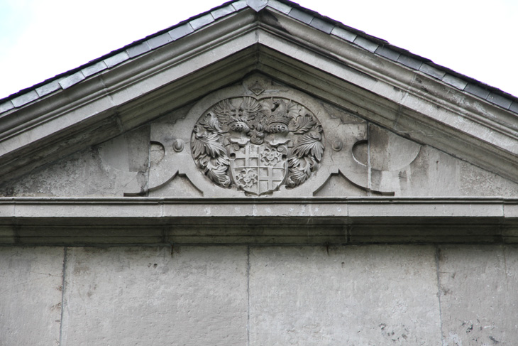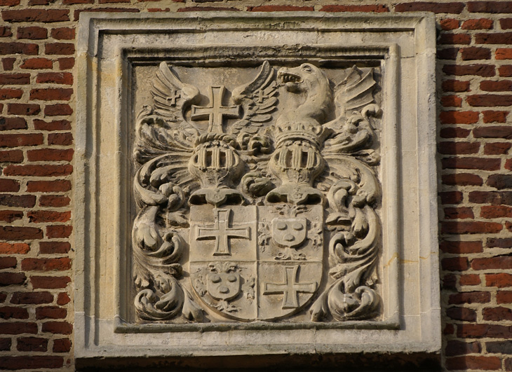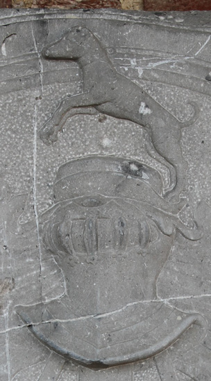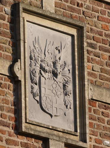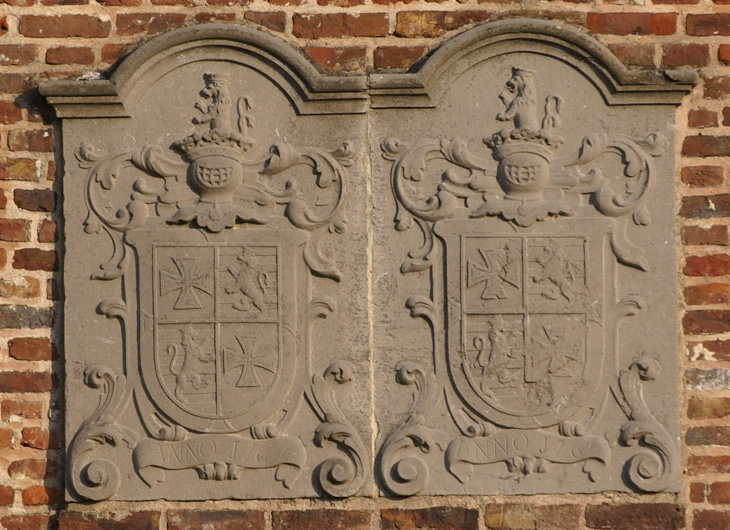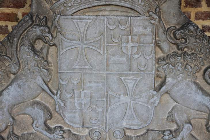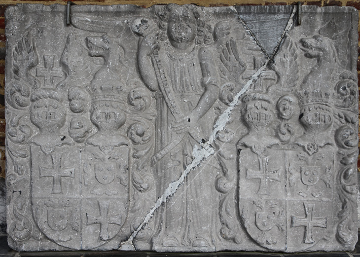 Abb.: Undatierte Spolie in der Durchfahrt durch den Südostflügel des Wasserschlosses, in der rechterhand und linkerhand in den Mauernischen ein kleines Lapidarium eingerichtet ist, mit dem Wappen des Landkomturs Jan van Goer, rechts Detailausschnitt. Es ist eines der seltenen Wappen, die auch das Kleinod zeigen.