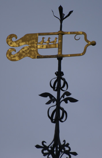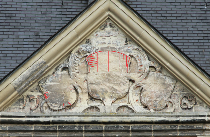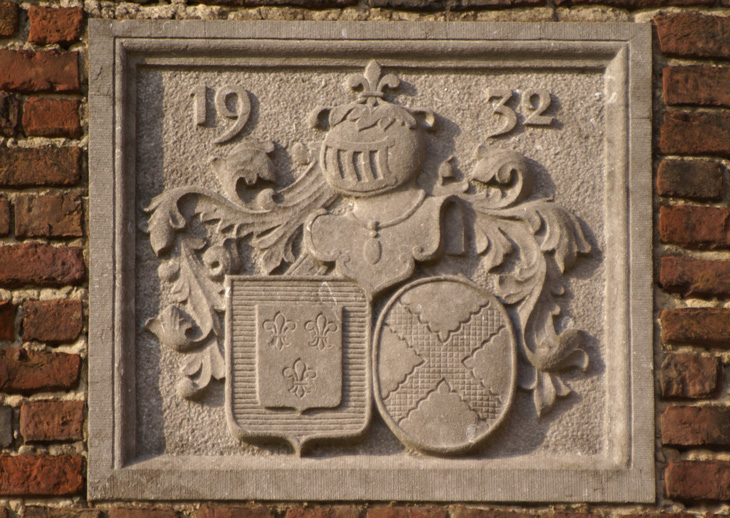 Dieses Wappen ist dasjenige an der Nordostseite des Glockenturmes. Die anderen drei Seiten waren früher auch mit solchen Wappen versehen, sie sind aber nicht mehr alle vorhanden. Das an der Nordwestseite ist abgeschlagen. Die großen Mengen Ziegel für den Bau des Wasserschlosses konnten übrigens vor Ort gebrannt werden, weil es Lehmschichten auf dem Gut und in der Umgebung gab.