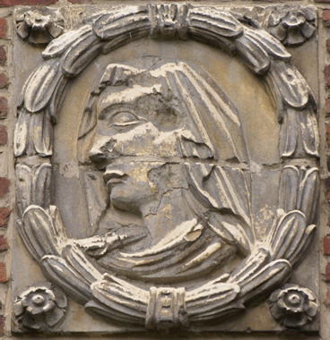 Abb.: Am Glockenturm ist in situ das des Landkomturs Jan van Goer in das Ziegelmauerwerk eingelassen, über den beiden Fenstern der obersten Stockwerke und unterhalb der Wehröffnungen der obersten Ebene.