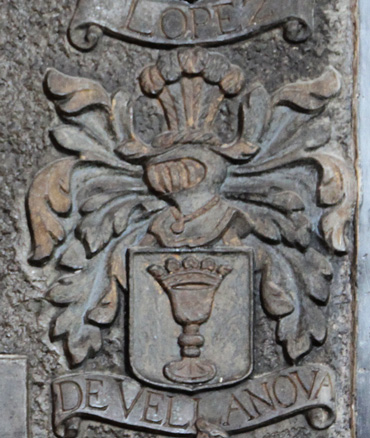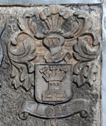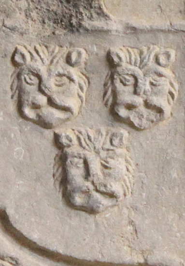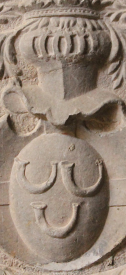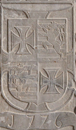 Das Wappen dieses Landkomturs kommt an zwei Stellen vor, einmal in situ am Glockenturm (ehemals sogar an allen vier Seiten), und einmal als Spolie im kleinen Lapidarium rechterhand in der Durchfahrt zum Wasserschloß-Innenhof.