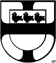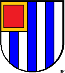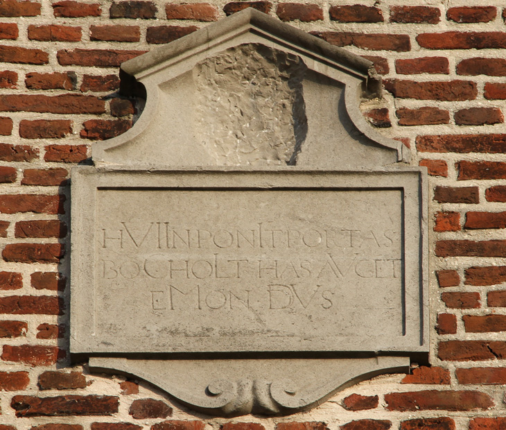 Abb.: Wasserschloß, Innenhof, unterstes Stockwerk des Glockenturms, zwei verschieden hohe Türen nebeneinander: Der Schild über der höheren Tür zeigt drei Pfähle, von einem Freiviertel überdeckt. Dieser Wappenstein aus dem 16. Jh. läßt sich Landkomtur Wynand van Breyll (amtierte 1536-1554) zuordnen. Laut Rietstap ist der Schild silbern mit drei blauen Pfählen und einem roten, golden bordierten rechten Obereck. Die Abb. unten zeigt sein Wappen einmal als reines Familienwappen wie hier am Treppenturm und einmal als Komturswappen, wie er es auch hätte führen können. Ein Vergleichswappen ist am niederländischen Kasteel Wolfrath in Holtum zu finden als Teil eines Ehewappens. Neben diesem Komturswappen befindet sich dasjenige seines Verwalters (siehe weiter unten).
