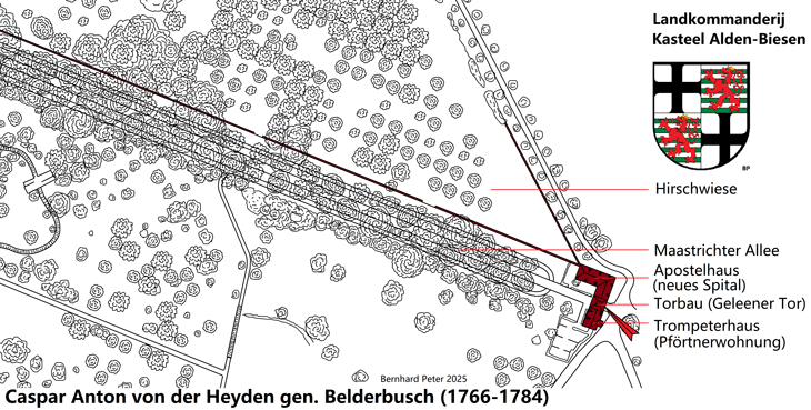 Diese Baugruppe liegt ca. 30 m höher als das Schloß. Früher trafen sich an diesem Punkt sieben Alleen, davon sind sechs noch nachvollziehbar. Eine Kastanienallee führt entlang der Gutsmauer nach Bilzen, eine Nußbaumallee führte nach Martenslinde, und eine Pappelallee führte nach Spouwen, aber dieser Weg ist heute stillgelegt. Eine Eichenallee führte nach Maastricht. Eine Ulmenallee führt in Richtung Weert. Die heutige Bosselaerstraat führt nach Süden in Richtung Tongeren. Diese Baugruppe steht an einem der höchsten Punkte der Region 112 m über dem Meer, und von dort oben hat man einen schönen Blick auf die geschützt in den Tälern liegenden Ortschaften, bei gutem Wetter bis zur Basilika von Tongeren. Man sieht aber auch Spuren der Industrielandschaf Mittellimburgs, die Abraumhalden der Kempener Kohlegruben, die Schornsteine eines Kraftwerks und den Fernsehturm von Genk. Von diesem Tor aus führte eine der Alleen in Richtung Maastricht, wo die Tochterkommende Neuenbiesen lag. Alle Wege führten sozusagen zum zentralen, höchsten Punkt, den Mittelpunkt eines Sternes von geradlinig abführenden Straßen bzw. Alleen. So wird der Zugang zur Landkommende zum Mittelpunkt der umliegenden Kulturlandschaft.