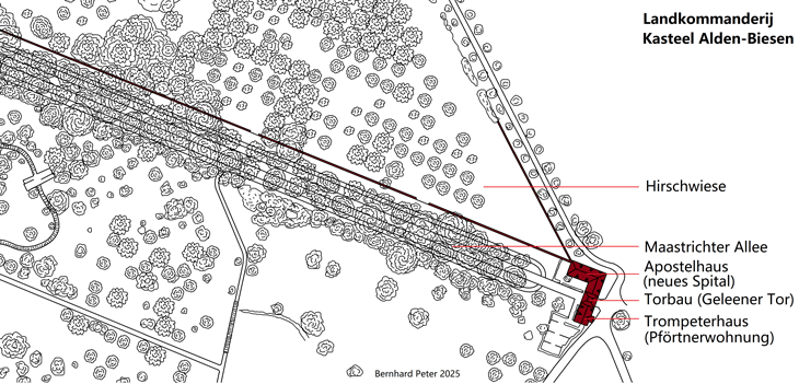 Zum Ensemble gehört noch eine weitere Baugruppe ganz am Ende der von mächtigen Kastanien gesäumten Maastrichter Allee: Dort befindet sich oben auf der Hochebene in der Mitte ein Torturm, das war der frühere Hauptzugang zur Domäne Alden-Biesen vor der Säkularisierung. Der dreistöckige Torturm besitzt ein elegantes Mansarddach mit Dachgauben und Rundbogenfenstern. Die Durchfahrt wird eingefaßt von einer Torblende mit abwechselnd rauhen und glatten Steinen. Auf dem Schlußstein ist das bärtige Gesicht eines alten Mannes zu sehen. Im Süden schließt sich das Trompeterhaus an, das ehemalige Quartier des Pförtners. Trompeterhaus heißt das wegen der Signaltrompete, mit der der Pförtner Besucher in Richtung Schloß ankündigte. Außerdem spielte er in einem kleinen Orchester der Kommende mit. Im Norden befindet sich das rechtwinklig abknickende Apostelhaus, das als neues Spital dienen sollte, aber seine Funktion als Armenhaus wohl nie aufgenommen hat. Letzteres wurde, da es zum einen verfallen und zum anderen im Zweiten Weltkrieg auch noch von Artillerie beschossen worden und schließlich ganz eingestürzt war, bei der Renovierung der Anlage komplett wieder aufgebaut und enthält heute ein Café.