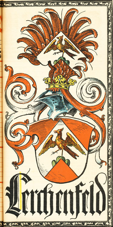 Lerchenfeld In Rot ein silberner Sparren, in dessen Giebel auf grünem Dreiberg eine flugbereite natürliche Lerche steht, auf dem gekrönten Helm mit rot-silbernen Decken ein roter Flug, beiderseits mit einem silbernen Sparren bez., in dessen Giebel auf grünem Dreiberg eine flugbereite natürliche Lerche steht. |