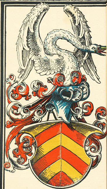 Hanau Fünfmal golden-rot gesparrt (sparrenförmig geteilt), auf dem ungekrönten Helm mit silbern-roten Decken ein wachsender, auffliegender silberner Schwan. |