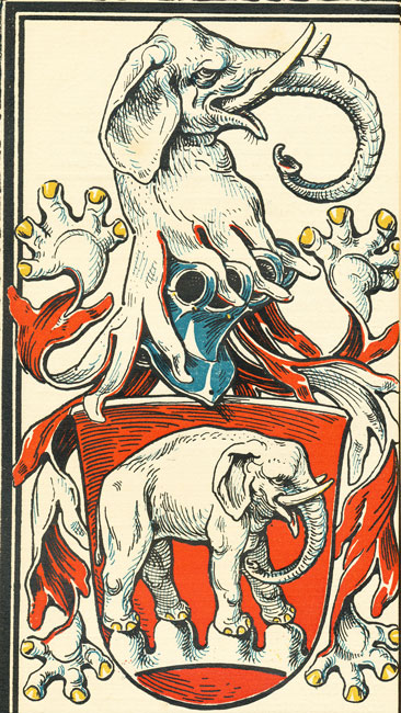 Helfenstein In Rot auf einem schwebenden (ledigen) silbernen Vierberg ein schreitender silberner Elephant (hier gewendet), auf dem ungekrönten Helm mit silbern-roten Decken ein wachsender silberner Elephantenrumpf. Das Ausziehen der Decke in Form von Elephantenfüßen fällt unter künstlerische Freiheit. |