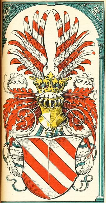 von Leuchtenberg In Silber ein blauer Balken, auf dem ungekrönten Helm mit blau-silbernen Decken ein wachsender Mannesrumpf in blauem Gewand mit goldenen Knöpfen und ebensolchem Kragen, auf dem Haupt ein blauer, silbern gestulpter spitzer Hut, der an der Spitze mit aus einer goldenen Krone hervorkommenden Straußenfedern besteckt ist, einer blauen zwischen zwei silbernen. |