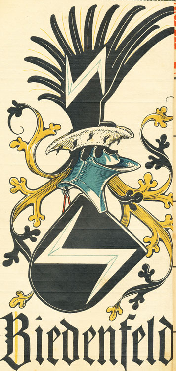 Biedenfeld In Schwarz ein schräggelegter silberner Doppelhaken (Widerhaken, Wolfsangel), auf dem ungekrönten Helm mit schwarz-goldenen Decken auf einem schwarzen, hermelingestulpten Turnierhut ein schwarzer, mit einem schräggelegten silbernen Doppelhaken (Widerhaken, Wolfsangel) belegter Flug. |