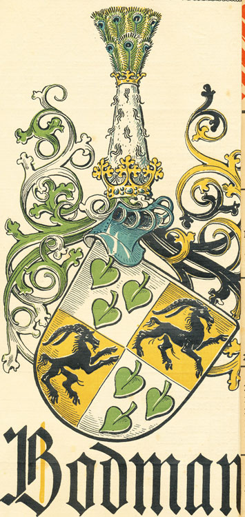 und Grafen von Bodman Geviert: Feld 1 und 4: in Gold ein schwarzer Bock. Feld 2 und 3: in Silber drei (2:1) grüne Lindenblätter, mit dem Stiel nach oben weisend, auf dem gekrönten Helm mit schwarz-goldenen und grün-silbernen Decken ein hoher, mit Hermelin bezogener Spitzhut, oben besetzt mit einer goldenen Krone, aus der ein Busch Pfauenfedern wächst. |