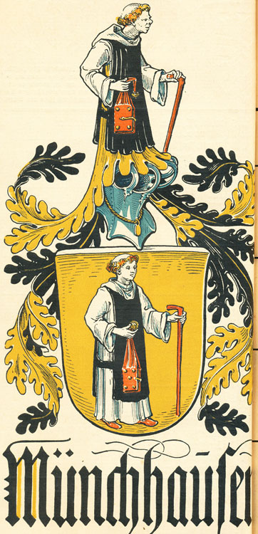 Münchhausen In Gold ein schreitender, halbrechts gekehrter Mönch in silberner Kutte, mit schwarzem Scapulier und mit silberner hinten herabhängender Kapuze, in der Linken einen oben gekrümmten roten Stab (Hirtenstab) haltend, in der Rechten ein Brevier haltend in rotem Futteral mit goldenen Verzierungen, auf dem ungekrönten Helm mit golden-schwarzen Decken wachsend ein Mönch in silberner Kutte, mit schwarzem Scapulier und mit silberner hinten herabhängender Kapuze, in der Linken einen oben gekrümmten roten Stab (Hirtenstab) haltend, in der Rechten ein Brevier haltend in rotem Futteral mit goldenen Verzierungen. |
