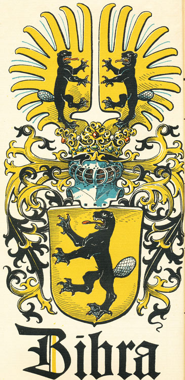 | von Bibra In Gold ein aufspringender schwarzer Biber mit roter Zunge und mit silbern geschupptem Schwanz, auf dem gekrönten Helm mit schwarz-goldenen Decken ein goldener, beiderseits einwärts mit dem schwarzen Biber belegter Flug. |