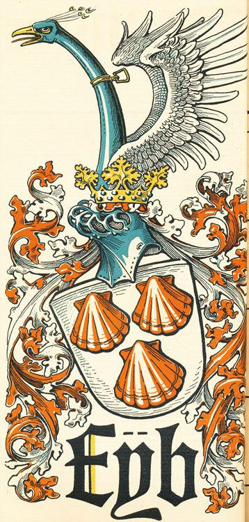 | von Eyb In Silber drei (2:1) rote Jakobsmuscheln (Pilgermuscheln), auf dem gekrönten Helm mit rot-silbernen Decken ein wachsender Pfau mit einem goldenen Ring um den Hals), der Rumpf blau (naturfarben), die Flügel silbern, der Schnabel golden. |