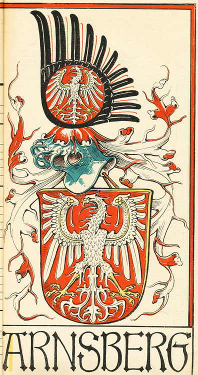 Arnsberg In Rot ein silberner, golden bewehrter Adler mit goldenen Kleestengeln, auf dem ungekrönten Helm mit rot-silbernen Decken ein schwarzer Flügel, belegt mit einer roten Scheibe mit einem silbernen, golden bewehrten Adler mit goldenen Kleestengeln. |
