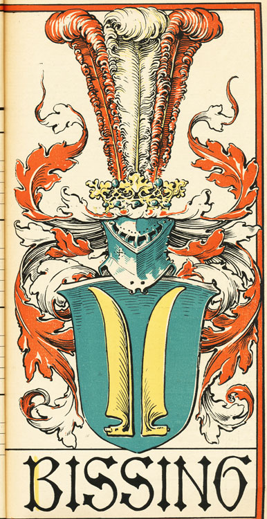 von Bissingen In Blau zwei pfahlweise gestellte goldene Sensenklingen Rücken an Rücken, auf dem gekrönten Helm mit rot-silbernen Decken drei Straußenfedern, eine silberne zwischen zwei roten. |