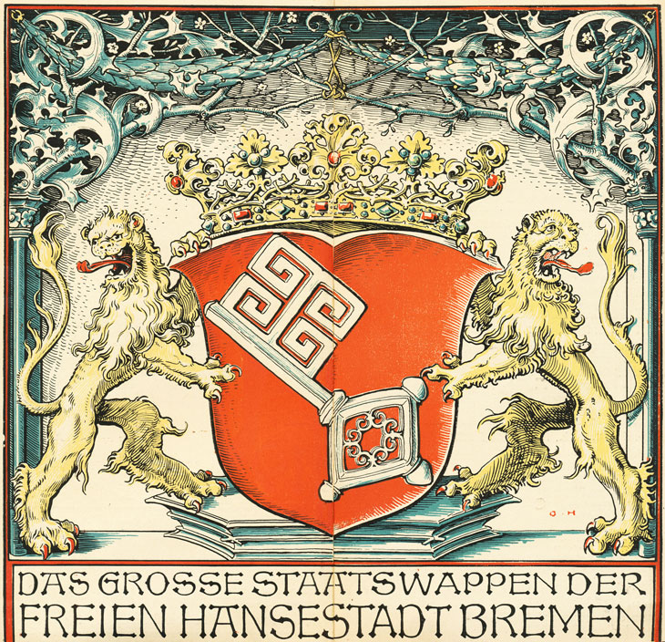 Bremen In Rot ein schräggestellter silberner Schlüssel, der Bart nach rechts und oben gerichtet. Schildhalter zwei widersehende goldene Löwen. |