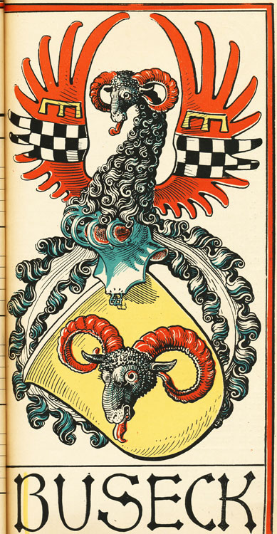 | von Buseck In Gold ein rot gezungter und gehörnter, schwarzer Widderkopf, auf dem ungekrönten Helm mit schwarz-silbernen Decken ein roter Flug, der beiderseits mit einem in drei Reihen schwarz-silbern geschachten Balken und darüber von einem dreilätzigen goldenen Turnierkragen belegt ist, dazwischen Kopf und Hals eines wachsenden schwarzen, rot gezungten und ebenso gehörnten Widders. |