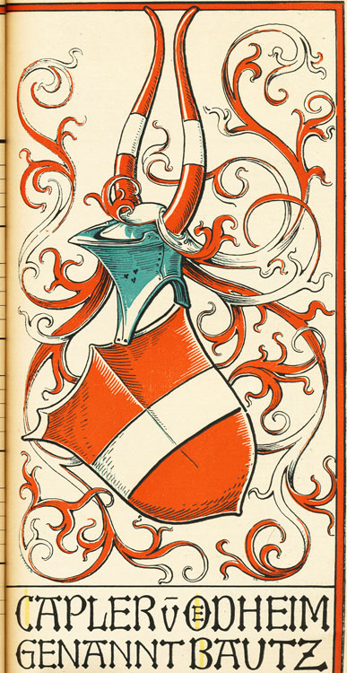 (Cappler) von Oedheim gen. Bautz, Bautz gen. Cappler In Rot ein silberner Balken, auf dem ungekrönten Helm mit silbern-roten Decken ein rotes Paar Büffelhörner mit je einem roten Balken. |