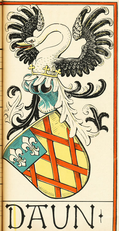 | von Daun In Gold ein verflochtenes rotes Schräggitter mit einem blauen rechten Obereck (Freiviertel), belegt mit zwei silbernen Lilien nebeneinander, auf dem gekrönten Helm mit silbern-schwarzen Decken ein wachsender silberner auffliegender Schwan mit schwarzen Flügeln und goldenem Schnabel. |