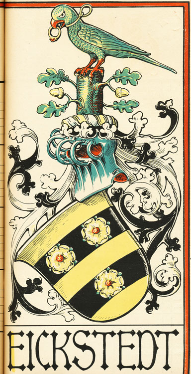 In Gold zwei schwarze Balken, diese belegt mit drei (2:1) goldenen Rosen, auf dem golden-silbern bewulsteten Helm mit schwarz-silbernen Decken auf einem pfahlweise gestellten, gekappten Eichenstamm mit vier grünen Blättern und zwei goldenen Eicheln sitzend ein grüner Sittich (Papagei) mit rotem Schnabel, roten Beinen, goldener Schlaufe um den Hals und goldenem Fingerring mit rotem Stein im Schnabel. |