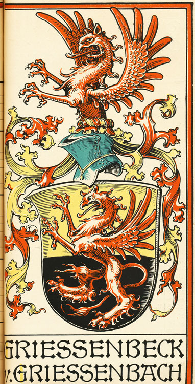 von Griessenbach In golden-schwarz geteiltem Schild ein roter Greif, auf dem rot-golden bewulsteten Helm mit rot-goldenen Decken ein wachsender roter Greif. |