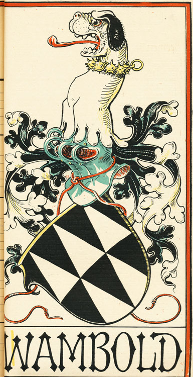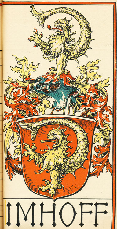 von Imhoff In Rot das Vorderteil eines goldenen Löwen mit einem über dem Kopf schwingenden Fischschwanz, den linken Pranken spreizend, den rechten vorwärts streckend (See-Löwe), auf dem ungekrönten Helm mit rot-goldenen Decken das Vorderteil eines goldenen Löwen mit einem über dem Kopf schwingenden Fischschwanz, den linken Pranken spreizend, den rechten vorwärts streckend (See-Löwe). |