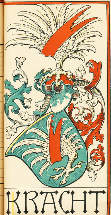 | von Kracht In Blau ein silberner, mit einem roten Schräglinksbalken belegter Klauenflügel (ein silberner Raubvogelfuß, oben ausgehend in einen silbernen, mit einem roten Schräglinksbalken belegten Flügel), auf dem ungekrönten Helm mit rechts blau-silbernen und linke rot-silbernen Decken ein silberner, mit einem roten Schräglinksbalken belegter Klauenflügel (ein silberner Raubvogelfuß, oben ausgehend in einen silbernen, mit einem roten Schräglinksbalken belegten Flügel). |