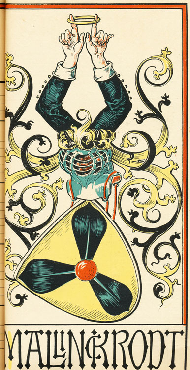 Mallinckrodt In Gold eine rote Kugel, um dieselbe drei deichselförmig im Dreipaß gestellte schwarze Blätter (Büffelohren), auf dem schwarz-golden bewulsteten Helm mit schwarz-goldenen Decken zwei schwarz mit silbernen Stulpen gekleidete wachsende, angewinkelte Arme, die Zeigefinger oben durch einen goldenen Ring gesteckt. |