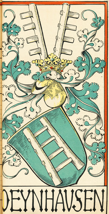Oeynhausen In Blau eine silberne viersprossige Leiter pfahlweise gestellt, auf dem gekrönten Helm mit blau-silbernen Decken die beiden Hälften einer gespaltenen silbernen viersprossigen Leiter mit den Sprossen nach außen gestellt (Leiterbäume). |
