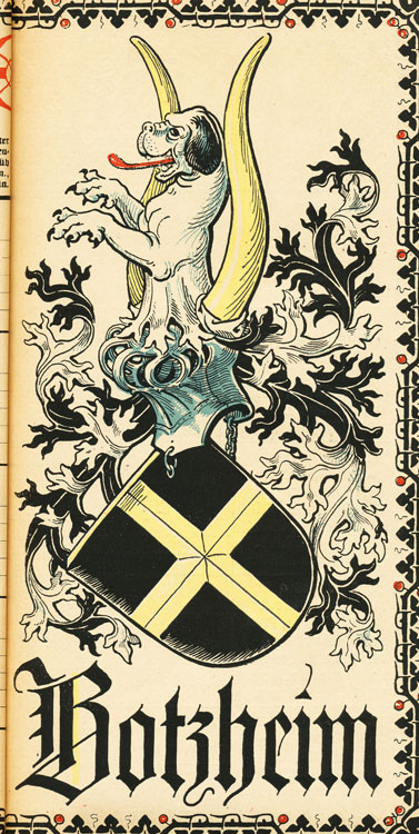 von Botzheim In Schwarz ein durchgehendes goldenes Kreuz, auf dem ungekrönten Helm mit silbern-schwarzen Decken eine wachsende, rotgezungte, silberne Bracke mit schwarzen Ohren zwischen zwei goldenen Büffelhörnern. |