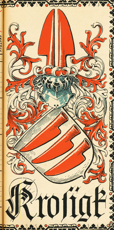 | von Krosigk In Silber drei balkenweise gelegte rote Pflugeisen, auf dem ungekrönten Helm mit rot-silbernen Decken zwei aufgerichtete rote Pflugeisen Rücken an Rücken. |