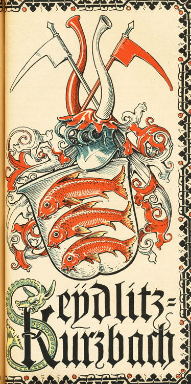 Seydlitz-Kurzbach, von Seydlitz In Silber drei balkenweise gelegte rote Fische übereinander, auf dem ungekrönten Helm mit rot-silbernen Decken zwei schräggekreuzte Fähnchen mit Schwenkel an Turnierlanzen, das schrägrechte silbern, das andere rot, zwischen zwei Büffelhörnern, rechts rot, links silbern. |